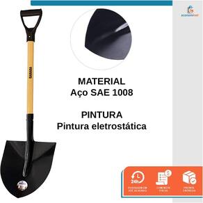 Pá de bico com cabo 3 RamadaFerramentas utilizadas principalmente em atividades agrícolas e na construção civil. Pás de bico são para juntar e carregar materiais.• É temperada em todo o corpo da peça, proporcionando maior resistência e menor desgaste durante o uso.• Recebe pintura eletrostática a pó, que tem uma melhor apresentação visual e maior proteção contra oxidação• Cabo com acabamento envernizado, para um melhor acabamento e apresentação do produto. A camada protetora em verniz incolor realça sua tonalidade, concedendo brilho e um toque mais liso ao produto.• Possui empunhadura plástica ergonômica.As pás são produzidas com aço SAE 1008 com 1,2mm e 1,5mm de espessura, estampadas e pintadas na cor preta.• Nº3 com cabo curto de madeira 68cm.• Empunhadura “Y” plástica Standard.Dimensões conforme imagem:A(mm): 305B(mm): 248C(mm): 950Modelo: 08921-E EAN: 7896438089211 Marca: Ramada