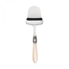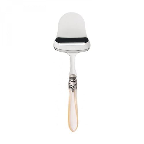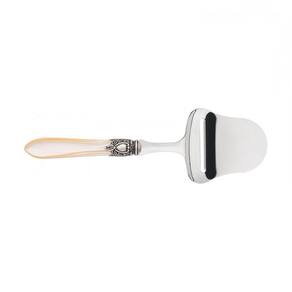 Para garantir uma mesa elegante e com espírito régio a pá para queijo da linha Oxford da Bugatti foi produzida em aço inox 18/10, com cabo de madrepérolaem acrílico enriquecido por um sofisticado anel com acabamento em prata antiga que lembra um nobre brasão.
