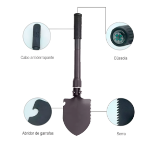 CARACTERÍSTICAS PRINCIPAIS:- Ferramenta com cinco funções muito úteis.- Picareta, pá, serra, abridor de garrafas e uma bússola.- Ferramenta versátil para qualquer atividade ao ar livre.- Pequeno e fácil de transportar.- Pegador de borracha reforçada para maior estabilidade e segurança.- Acompanha uma bolsa em nylon.- Material: Aço inoxidável e borracha.- Tamanho: 41cm x 9,7cm.- Peso: 350g.TEMOS SEU PRODUTO EM ESTOQUE ENVIAMOS SEU PEDIDO EM ATÉ 1 DIA ÚTILAPÓS A CONFIRMAÇÃO DO PAGAMENTO.