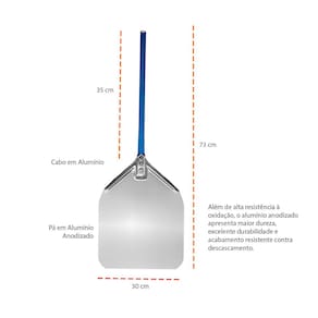 Pá para pizza com cabo. A pá é perfeita para enfornar pizza no forno a lenha, transformando sua cozinha em uma pizzaria artesanal. A pá foi produzida em aluminio anodizado, de alta resistencia à oxidaçao, excelente durabilidade e acabamento resistente contra descascamento. O destaque desta pá é sua borda rebaixada, suave e regular, que torna o processo de pegar a pizza na bancada de trabalho uma tarefa simples e sem esforço. E para garantir segurança e estabilidade maxima, a junçao entre o cabo e a cabeça da pá é reforçada por tres grandes rebites em linha, eliminando qualquer vibraçao e proporcionando um conforto incomparavel durante o uso.