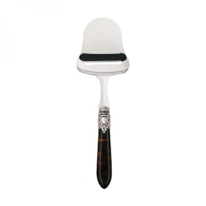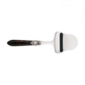 Para garantir uma mesa elegante e com espírito régio a pá para queijo da linha Oxford da Bugatti foi produzida em aço inox 18/10, com cabo de madrepérolaem acrílico enriquecido por um sofisticado anel com acabamento em prata antiga que lembra um nobre brasão.
