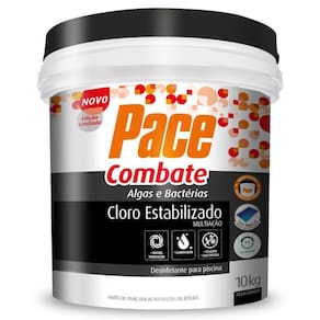 Indicado para piscinas residenciais.Composição:trocloseno de sódio: 50 - 70%Cloreto de sódio: 30 - 50%Sulfato de cobre pentahidratado: 0,25 - 1%Instruções de Uso:1 Avalie os parâmetros da água da piscina e ajuste-os, se necessário.Primeiro a alcalinidade entre 80 e 120 ppm e depois o pH entre 7,0 e 7,4.2 Com o sistema de filtração em funcionamento, na posição Filtrar,aplique 4 gramas do Pace Combate para cada 1000 litros 1m de água, espalhando o produto diretamente na piscina, ao longo das laterais, dia sim, dia não, sendo, de preferência, à noite.3 Dependendo da frequência de uso da piscina, da intensidade do sol e das chuvas, a dosagem deverá ser ajustada.4 Em caso de água turva, odores desagradáveis ou irritação nos olhos, ajuste a alcalinidade e o pH para as faixas ideais e, posteriormente, faça uma supercloração com 14g do Pace Combate para cada 1000 litros 1m de água.5 Meça o teor de cloro livre na manhã seguinte. Somente permita a entrada da pessoa na piscina quando o residual deste estiver na faixa de 1 a 3 ppm.6 Filtre a água diariamente, por um período mínimo de 6 horas. Dúvidas Frequentes:- Qual o percentual de cloro ativo na fórmulaR: Aprox. 30% de cloro ativo.- Ele vem com o dosadorR: Sim, acompanha dosador.- Qual a diferença entre o cloro aditivado e o não aditivadoR: O cloro não aditivado é mais concentrado, porém possui somente cloro na fórmula.Esse modelo aditivado possui outras substâncias na fórmula entretanto possui um teor menor de cloro ativo.- A água tratada com este produto serve para beber e cozinharR: Não, somente para o banho, não pode ser Utilizado para consumo.- Controla o PH da águaR: Este cloro não tem este agente que trabalha na regulagem do Ph da água.