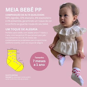 Cada par de meias é cuidadosamente projetado para se ajustar confortavelmente aos pezinhos do seu bebê, garantindo um ajuste perfeito e sem irritações. Com uma mistura de algodão macio e elastano durável, nossas meias são feitas para durar.