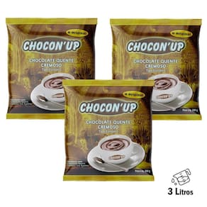 Chocon'up - Chocolate Quente Cremoso Tipo Europeu Pack com 3 unidades de 200g O Chocon'up é uma base pré pronta para o preparo do delicioso chocolate quente cremoso tipo europeu. Em sua formulação de origem europeia, com alto teor de cacau e levemente adoçado para que seu sabor seja único. Versátil Além de deliciosos chocolates quentes cremosos utilize o Chocon'up também para o preparo de cobertura ou recheio de bolos, fondue, panquecas , waffe , crepe, pizza, bebidas preparadas muisturadas com bebibas alcoólicas choconhaque, chocowhisky, chocorum, chocorula, etc no petit gateau , em salada de frutas entre demais receitas. 1 pacote de 200g rende 1 litro , aproximadamente 12 xícaras deste maravilhoso chocolate quente cremoso.