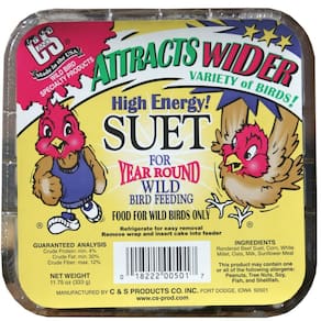 Suplemento alimenticio C&S de alta energía en sebo de 333 g, paquete de 12 unidades. - Ideal para comederos de tortas de sebo - Contiene semillas de girasol, mijo y maíz para mayor nutrición - Atrae carpinteros, trepadores azules, carboneros, urracas y estorninos - Alimento energético para aves silvestres únicamente - Tortas de sebo de alta energía para alimentación de aves silvestres todo el año - Este sebo atrae a una amplia variedad de aves silvestres y les proporciona una dieta nutritiva - Para facilitar su extracción del envase, refrigere antes de alimentar