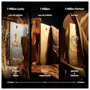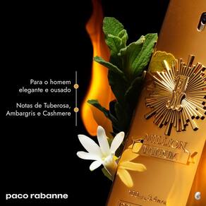 O Perfume Masculino 1 Million Parfum, de Paco Rabanne, traz acordes extravagantes de tuberosa, ambargris e cashmere, combinados com couro e ládano. O perfume One Million traz uma essência sofisticada, que destaca a opulência do couro com um toque salino, retido dentro do famoso frasco luxuoso em formato de uma barra de ouro.
