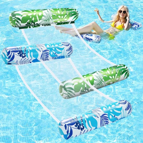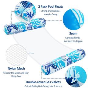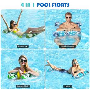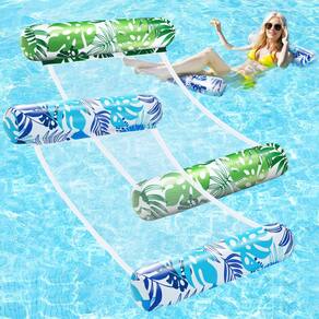 Boias de piscina – Pacote com 2 boias infláveis de piscina, boias de piscina 4 em 1 para adultos, boias de piscina tamanho adulto, brinquedos multifuncionais flutuadores para piscina, espreguiçadeira de piscina de PVC grosso, rede flutuante de água - Materiais de alta qualidade – nossas boias de piscina usam material de PVC espesso e atualizado e malha de náilon, alta qualidade, durável, resistente, antipoluição e macio. O apoio de cabeça e os pés oferecem bastante suporte e muito conforto. Design de peça única, reduz a superfície de soldagem, vedação forte, não é fácil de vazar. Design de válvula de gás de tampa dupla, enchimento e esvaziamento rápidos, vedação garantida. - Tamanho perfeito: projetado exclusivamente para rede de água, o design ergonômico deste brinquedo de piscina com capacidade para uma pessoa oferece amplo suporte e conforto abundante. Medindo 127 x 76 cm quando inflado, o comprimento maior dá a você mais espaço para sentar ou deitar, permite que você se sente confortavelmente na água e aproveite a diversão sem fim deste verão. NOTA: Idade recomendada: 16 anos de idade e acima, 1,2-1,8 m de altura, carga máxima: 120 kg, crianças precisam ser usadas sob a supervisão de um adulto. - Boias de piscina 4 em 1 – as boias de piscina podem atender às suas várias formas de diversão. Pode ser convertido em uma rede, espreguiçadeira, e sela. As boias para adultos são ideais para uma variedade de atividades recreativas, como conversar, descansar e ler na água. Observação: não mergulhe os flutuadores em água por um longo tempo após o uso. A boia deve ser seca e colocada em um saco de armazenamento para que o produto possa ser utilizado por mais tempo. - Fácil de transportar e armazenar – você pode esvaziar as boias de piscina para adultos e depois dobrá-las, é tão conveniente para carregar quanto um livro, colocá-las em sua mochila, bagagem, etc., conveniente para sua viagem. Perfeito para festas na piscina ou férias na praia. É um brinquedo de piscina essencial para piscinas de verão, permitindo que você se divirta na água. - Melhor escolha de verão: em um dia quente de verão, uma rede de piscina é o presente perfeito para brincar na água com seu parceiro, família ou amigos. Convide-os para uma festa de verão ao ar livre na piscina, praia, lago, rio, etc., aproveite o sol, aproveite e relaxe. o padrão de folhas azuis e verdes torna a rede flutuante da piscina mais requintada, tornando você uma presença brilhante na piscina.