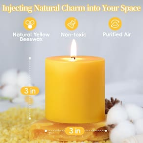 Infundido com romance e elegância em casamentos, feriados especiais, orações e até mesmo reuniões de família, o aroma exclusivo da vela de cera de abelha traz uma experiência fresca e confortável. Tempo de queima: 50 horas, pode melhorar o efeito visual e aumentar a atmosfera Características das velas de pilar de cera de abelha: sem fumaça, sem gotejamento, melhora efetivamente o ar, fragrância leve de néctar das flores, para atender ao uso de queima a longo prazo Aplicação: decoração de restaurante, spa, ioga, estudo, inauguração de casa Especificações do produto: Dimensões do produto: 7,6 cm (P) x 7,6 cm (A)polegadas; pacote com 2 velas de cera de abelha; conjunto de 4 velas de pilar de cera de abelha - Velas de cera de abelha natural: nossas velas de cera de abelha são feitas de cera de abelha natural, com um leve aroma de néctar das flores natural e cor única do néctar das flores. A cera de abelha foi completamente filtrada para se livrar das impurezas, com mechas 100% algodão, combustão sem fumaça, mais ecológica - Velas de cera de abelha 100% natural: cada vela de cera de abelha é feita com o máximo cuidado, usando cera de abelha 100% natural e pavio de algodão, sem fumaça, sem gotejamento, velas de cera de abelha garantem apenas a melhor qualidade para sua diversão. As velas de cera de abelha sem cheiro as tornam companheiras ideais para casamento, igreja, casa ou outras atividades relaxantes - Queima de 100 horas de longa duração para emergência: as velas de pilar de cera de abelha oferecem longevidade excepcional devido ao seu alto ponto de fusão, queimando significativamente mais devagar do que outros tipos de velas. Com tempos de queima que se estendem até 50 horas por vela, ou 100 horas no total para um par, elas fornecem iluminação e ambiente de longa duração. Este tempo de queima prolongado os torna ideais para uso prolongado, garantindo prazer e valor duradouros - Benefícios naturais das velas de cera de abelha: queime estas velas de cera de abelha para desfrutar do aroma puro e natural da cera de abelha. Além disso, a vela de cera de abelha pura totalmente natural pode liberar íons negativos, ajudando a criar um ambiente fresco e saudável - Usos versáteis para todas as ocasiões: seja uma emergência, igreja, evento comemorativo ou simplesmente decoração para o jantar, estas velas sem gotejamento são a escolha perfeita. Elas são ótimas adições para casamentos, reuniões e casas