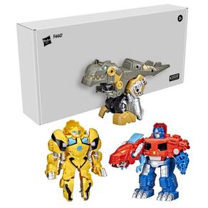 - 3 brinquedos de dinossauro: este pacote de 3 vem com Optimus Prime, Bumblebee e Grimlock, brinquedos de dinossauro que convertem o tamanho certo para mãos pequenas