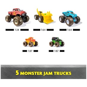 - 5 MONSTER JAM TRUCKS - Colecione todos os 5 caminhões Monster Jam ao mesmo tempo! Este pacote inclui um caminhão escavador de covas em escala 1:24; Scoopz and whiplash em escala 1:64; e Mini El Toro Loco e Grave Digger