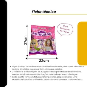Contém: 1 pacote de 400 g de pirulitos princess pop que tatuam temporariamente a língua com um desenho . Pirulito sabor morango, colorido e aromatizado artificialmente. Pirulito com tatuagem de língua Princesas O pirulito tatoo é uma nova sensação: ele é capaz de tatuar temporariamente a língua com uma figura. Para conseguir o melhor efeito, pressione o pirulito por um tempo sobre a língua, sem mover. Ótimo para distribuir a crianças no final da festa, pois irão se divertir muito As estampas são e temáticas de acordo com o pacote. A Festa de todo mundo fica muito mais doce com guloseimas, docinhos e pirulitos. Adoce sua festa com doces para criançada. Com certeza será uma sensação entre as crianças e também entre os adultos Experiência Divertida: Destaque o diferencial do pirulito com tatuagens de língua, proporcionando uma experiência interativa e divertida que encanta crianças e provoca sorrisos. Sabor Incrível: Informe sobre os sabores deliciosos que acompanham cada pirulito, garantindo que a diversão venha com um gosto irresistível que todos adoram. Ideal para Eventos Temáticos: Enfatize que esses pirulitos são perfeitos para festas de aniversário, especialmente com o tema de princesas, adicionando um toque especial e único à celebração. Formato Atrativo: Atraia a atenção para o design charmoso e colorido dos pirulitos, que não só são gostosos, mas também atraem visualmente, tornando-os irresistíveis para os pequenos.