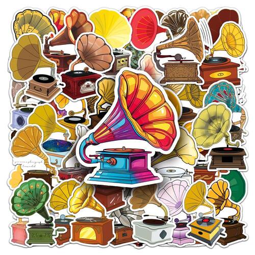 Pacote de 50 adesivos de gramofone, decalques de desenhos animados com fonógrafo retrô vintage, adesivos de vinil impermeáveis para laptop, álbum de recortes, diário, capa de telefone, artesanato em resina DIY, decoração com tema musical