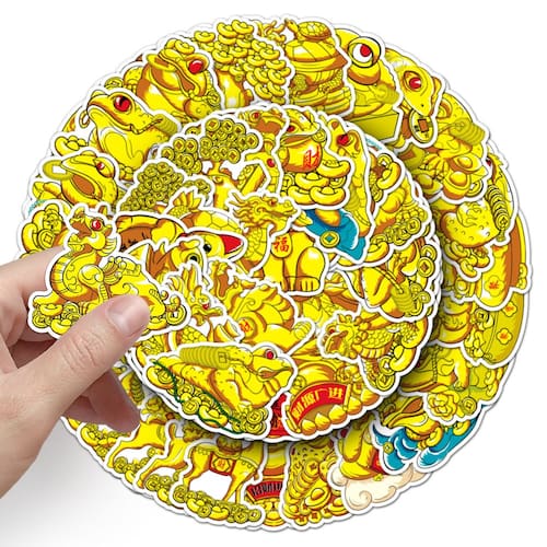 Material: papel e vinil Peso: 30-60 g Tamanho: 3-6 cm Quantidade: 50 unidades Tema Fortune & Prosperity — Inclui 50 adesivos de vinil exclusivos com ícones culturais chineses, como dragões dourados, sapos monetários, lingotes, moedas e outros símbolos tradicionais da sorte. Material impermeável durável — Feitos de PVC de alta qualidade com laminação brilhante, esses decalques são à prova d'água, resistentes a arranhões e à prova de desbotamento, garantindo designs dourados brilhantes de longa duração. Uso decorativo versátil — perfeito para decorar laptops, cadernos, skates, capas de telefone, malas, diários, álbuns de recortes, capacetes e garrafas de água com designs simbólicos de prosperidade. Para crianças, adolescentes e adultos — A arte cultural divertida em estilo de desenho animado torna esses adesivos atraentes para todas as idades, ideais para artesanato, material escolar e decoração festiva sazonal. Fácil de descascar e não deixar resíduos — Os adesivos se aplicam suavemente, são removidos de forma limpa sem deixar resíduos e podem ser reutilizados, oferecendo flexibilidade para decoração criativa e personalização de itens.