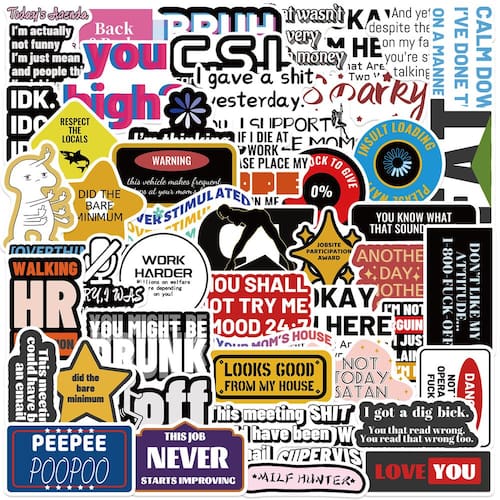 Material: papel e vinil Peso: 30-60 g Tamanho: 3-6 cm Quantidade: 100 unidades 100 designs exclusivos Inclui 100 adesivos de vinil criativos com animais fofos, citações engraçadas, memes e arte em estilo grafite, perfeitos para decoração DIY e expressão pessoal. Impermeável e durável Feito de vinil de PVC premium com revestimento impermeável e resistente a UV, garantindo cores brilhantes e uso duradouro em ambientes internos e externos. Aplicação Peel & Stick Fácil de usar com forte adesão, removível sem deixar resíduos pegajosos, segura para laptops, notebooks, capas de telefone e garrafas de água. Decoração multifuncional. Ótima para personalizar malas, skates, diários, álbuns de recortes, guitarras, capacetes e outras superfícies planas com humor e criatividade. Diversão para adolescentes e adultosPerfeito para estudantes, funcionários de escritório e qualquer pessoa que adore adicionar um toque de personalidade divertida aos seus pertences.