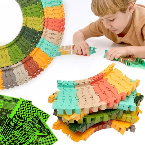 Alimente sua imaginação com o pacote Extra Track Pieces & Glow Stickers! Este conjunto adicional permite que as crianças expandam seu universo de pista de corrida com 72 peças extras em cores vibrantes e designs exclusivos, perfeitas para construir, torcer e personalizar seu mundo de corrida. Três folhas de adesivos que brilham no escuro dão mais emoção às corridas noturnas, permitindo que as crianças criem cada pista como quiser. O conjunto também vem em uma caixa de armazenamento resistente, mantendo as peças organizadas e facilitando a diversão para qualquer lugar. Totalmente compatível com todos os veículos movidos a bateria e nossos conjuntos de pistas temáticas, este pacote garante horas de jogo criativo e seguro que atendem aos padrões de qualidade americanos. Perfeito para jovens pilotos prontos para melhorar suas pistas!