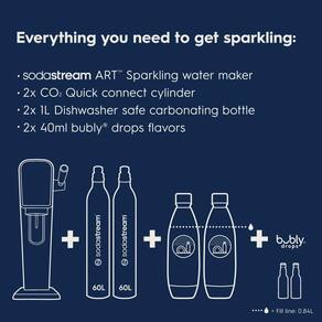 SodaStream Conjunto Art Sparkling Water Maker (preto), com CO2, garrafas DWS e sabores de gotas de bolhas - Faça água com gás fresca com o apertar de um botão. - Inclui: máquina de água com gás, (2) cilindros de CO2 de 60 L, (1) pacote duplo de garrafa lavável na lava-louças e (2) sabores de gotas de bolhas de 40 ml - Eficiência energética, alimentado por cilindro de CO2. Cada cilindro de CO2 carbonata até 60 litros de água. - Inserção de garrafa de encaixe fácil de usar para carbonatação rápida - Compatível com todos os sabores SodaStream e garrafas de carbonatação SodaStream (sem BPA e melhor para o planeta), exceto a garrafa de vidro SodaStream - SodaStream As máquinas de arte são compatíveis apenas com o cilindro de CO2 SodaStream Quick Connect