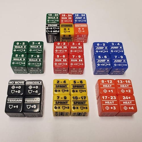 Esses dados facilitam o controle de seus modificadores e penalidades no campo de batalha ou em seus cartões de referência. Walk Run Jump & Sprint A distância de viagem é claramente indicada para que você possa ver facilmente você e seus oponentes atingirem modificadores. Os dados Special Movement & Modifier abrangem outras condições que você pode encontrar e os dados Heat rastreiam seus modificadores relacionados ao calor.