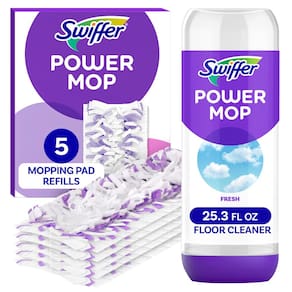 - Inclui 5 refis de esfregão PowerMop multisuperfície e 1 frasco de 750 ml de solução de limpeza de piso Swiffer PowerMop, aroma de lavanda