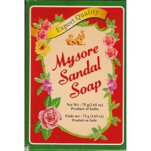 - O sabonete Mysore Sandal é o único sabonete do mundo feito com óleo de sândalo 100% puro, o material de perfumaria mais antigo conhecido. O óleo de sândalo recomendado em textos ayurvédicos antigos para cuidados com a pele, tem excelentes propriedades antissépticas e acalma o calor espinhoso e outras erupções cutâneas. Este sabonete é feito totalmente de ingredientes vegetais puros. O óleo de sândalo Mysore utilizado no sabonete é destilado pelo governo de Karnataka, Índia.
