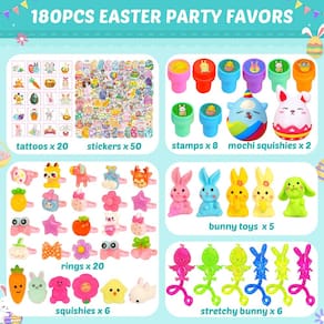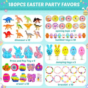 - Conjunto de enchimento de ovos de Páscoa de 180 peças: este conjunto abrangente inclui 180 pequenos brinquedos para enchimentos de ovos de páscoa, tornando-o perfeito para enchimentos de ovos de páscoa e recheios de ovos de páscoa. Ideal para grandes caças de ovos de Páscoa ou festas!