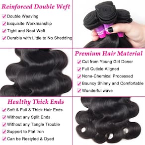 - Qualidade dos feixes ondulados do corpo de cabelo humano: feixes de cabelo humano 12A, trama forte de máquina dupla, tecelagem de cabelo humano, sem queda, sem emaranhados, sem cheiros, grosso de cima a pontas, trama macia, trama de cabelo saltitante e brilhante com alta elasticidade, firme e limpa, cutícula unidirecional sem pontas duplas
