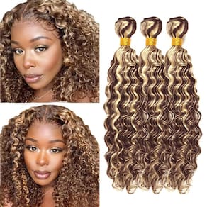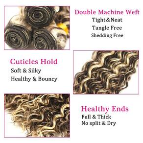 - ?Tipo e cor do pacote de cabelo? Cabelo humano ondulado profundo. Cor P4/613, dois tons marrom escuro misturado com loiro.