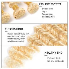 Leruikair Blonde 613 Deep Human Hair Bundles Information Material do cabelo: 100% cabelo humano profundo loiro virgem brasileiro não processado 613 Textura do cabelo: Feixes de cabelo humano profundo loiro brasileiro 613, podem ser passados a ferro e remodelar Cor do cabelo: como mostra a lista loiro 613 mechas de cabelo humano profundo, pode ser tingido e descolorido Grau do cabelo: Cabelo humano virgem brasileiro 10A 3 mechas Comprimento do cabelo: 20-76 cm Loiro virgem não processado 613 mechas de cabelo humano profundo Peso do cabelo: 100 g/pacote Trama do cabelo: Trama dupla de máquina forte, loiro fiel ao comprimento 613 mechas de cabelo humano profundo Pacote de cabelo: 3 unidades loiro 613 mechas de cabelo humano profundo em um pacote. P: Pode ser alisado? R: Enrolado Encontre a temperatura correta (160 ~ 180 graus Celsius ou 320 ~ 360 Fahrenheit graus!) para enrolar o cabelo. O controle do tempo é muito importante, sugerimos que a varinha/cachos fique no cabelo por volta de 8 a 10 segundos com a temperatura adequada. Aplique um pouco de spray de cabelo para manter o padrão de cachos durável durante todo o dia. P: Pode ser tingido? R: Branqueado. Todos os nossos cabelos podem ser tingidos na cor escura que você deseja. Você precisa fazê-lo profissionalmente para obter a cor exata sem danificar o cabelo. Como o cabelo virgem ficará facilmente seco depois de deixar o doador, condicione seu cabelo regularmente após tingir ou alisar para mantê-lo. P: Quantos pacotes para uma cabeça inteira? R: Como todos sabemos, quanto maior o comprimento do cabelo, mais fino será o cabelo. Em geral, são necessários 3-4 feixes para uma cabeça inteira Leruikair Blonde 613 Deep Human Hair Bundles Sugestões de cuidados 1. Lavar e condicionar profundamente o cabelo regularmente. 2. Desembaraçar o cabelo suavemente com as mãos antes de lavar. Não esfregue ou torça o cabelo. Sugerimos que você use água morna para lavar o cabelo. 3. Deixe o cabelo secar naturalmente. Não exponha ao sol ou seque com secador de cabelo - Material do cabelo humano: mechas de cabelo humano encaracolado loiro virgem brasileiro não processado 613, macio e saudável para costurar ou perucas. - Vantagem dos pacotes: trama de máquina dupla, firme e limpa, queda mínima, sem emaranhado, sem cheiro, fácil de cuidar, dura mais. - Cabelo humano encaracolado loiro 613 cor: os mechas são de cor natural. Podem ser alisados, enrolados, estilizados como seu próprio cabelo. - Peso e comprimento do cabelo: 95-105 g/feixes, (cerca de 93 a 99 g/peça), 20 a 76 cm, múltipla escolha, peso total e fiel ao comprimento. - Mais bonita: perfeita para uso diário, Halloween, Natal, shows, festas temáticas, casamentos, encontros e assim por diante, deixa você mais bonita e confiante!