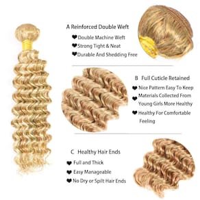 Olá, meu querido! Bem-vindo à loja Poirewsa Hair! A Poirewsa Brand é uma empresa especializada na produção de cabelo humano. Temos quase 10 anos de experiência de produção com muitos profissionais altamente qualificados e máquinas avançadas, certifique-se de que cada cabelo seja de alta qualidade. Cada cabelo é feito com coração. Temos o departamento de inspeção de qualidade mais rigoroso, então continuamos melhorando, inovando. Descrição do produto: 1. Cor do cabelo: P27/613 Cabelo humano loiro destacado 2. Textura do cabelo: Ondas profundas mechas de cabelo humano 3. Material do cabelo: 10A cabelo humano virgem brasileiro não processado 4. Qualidade do cabelo: trama de máquina dupla, firme e limpa, sem emaranhados, queda mínima, saudável e limpo, macio e completo, brilho natural, sem cheiro 5. Comprimento e peso do cabelo: 30 a 86 cm, 50 gramas por pacote. 6. Densidade do cabelo: 150% densidade total. Perguntas frequentes P1: Vai cair e emaranhar? A1: Nosso cabelo não vai cair ou embaraçar porque é um cabelo humano intacto com cutículas. No entanto, geralmente também fica emaranhado devido à seca, solução salina ou sujeira, recomenda-se limpar o cabelo regularmente (uma ou duas vezes por semana) com xampu e condicionador de qualidade, óleo essencial é essencial. P2: Posso tingi-lo em outra cor e fazer outro estilo? A2: Claro, nossos cabelos podem ser tingidos, descoloridos, permanentes, alisados e enrolados. Sugerimos que você deixe um estilista experiente processar o cabelo. P3: Como limpar a peruca? A3: Penteie suavemente o cabelo com um pente de dentes largos e mergulhe-o em água morna. Limpe o cabelo com xampu, lave o cabelo suavemente, não torça. Cubra o cabelo com condicionador para adicionar umidade, deixe o condicionador ficar no cabelo por alguns minutos, enxágue o cabelo com água limpa. Absorva o excesso de água com uma toalha e deixe o cabelo secar naturalmente, não exponha à luz solar. Junte-se a nós! Para serem melhores juntos! Sua nova escolha para penteados este ano! - Material dos mechas de cabelo humano: mechas de grau 10A O cabelo humano é feito de cabelo humano virgem brasileiro não processado. Natural e saudável, macio e confortável, cria um penteado mais natural sem esforço. - Qualidade do cabelo humano: trama de máquina dupla, muito macia e sedosa, firme e limpa, sem emaranhamento, queda mínima, sem tratamento químico, pode ser enrolado, descolorido, tingido e estilizado. O cabelo virgem de boa qualidade permite que você estilize seu cabelo de várias maneiras para mostrar sua beleza e charme. - Comprimento e peso dos feixes de ondas profundas: o comprimento do cabelo humano é de 30 a 86 cm, o peso é de 50 gramas por pacote. - Cor das extensões de cabelo humano: P27/613 Cabelo humano loiro com destaque para cabelo humano é muito bonito e moderno. - Adequado para todos os tipos de ocasiões: como banquete, casamento, cerimônia de formatura, temporada de abertura, festa na piscina, trabalho diário, você ficará confiante com ele.