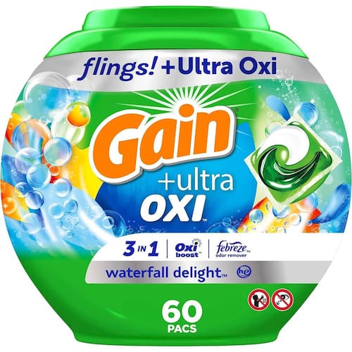 Gain Frascos de detergente para roupas Ultra Oxi Flings, 60 unidades, aroma de cachoeira, 3 em 1, compatível com HE