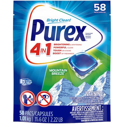 - Este pacote inclui uma bolsa de 58 pacotes de detergente de roupa Purex 4 em 1 com fragrância Mountain Breeze, o suficiente para 58 cargas.
