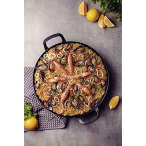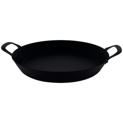Paellera profissional de ferro com espessura de 2,25 mm que distribuir o calor de maneira rápida e uniforme. Versátil para o preparo de diferentes receitas. Transfere o calor de forma ideal para um cozimento rápido. Maior vida útil para sua frigideira. Acabamento Durprotect, tecnologia exclusiva Tramontina, oferece resistência à abrasão e reduz o surgimento de corrosão nas frigideiras de ferro.Alças rebitadas que garantem maior segurança durante o .