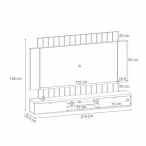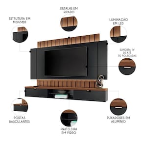 Produzido em MDF/MDP e com pintura UV, o Painel de possui 2 portas basculantes com puxadores na cor champanhe, que oferecem espaço para guardar objetos e acessórios. Além disso, ele conta com uma prateleira de vidro que pode ser usada para expor itens decorativos ou aparelhos eletrônicos. O detalhe em madeira ripada na parte superior do painel confere um toque de sofisticação e elegância ao ambiente. O Painel Suspenso suporta de até 70 polegadas e possui iluminação em LED, que cria um efeito aconchegante e charmoso. Ele é ideal para quem quer aproveitar melhor o espaço da sala e valorizar o seu estilo.