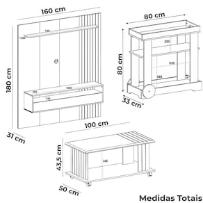 Peso máximo suportado: Painel 17kg/ Mesa de centro 13kg/ Carrinho Bar 09kg.