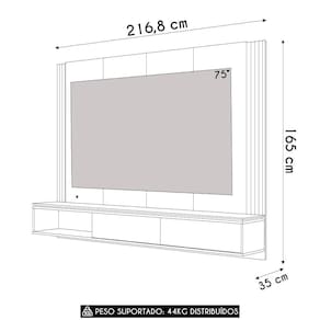 É fabricado em MDP e MDF com acabamento em pintura UV e fitas de borda em papel, materiais de alta qualidade que garantem máxima resistência no uso diário. Projetado para acomodar TVs de até 75 polegadas, o Painel é suspenso, o que otimiza o espaço, deixando a área de circulação livre e proporcionando uma aparência clean e visualmente agradável.