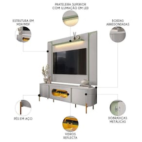 Já o Painel possui uma prateleira robusta e acabamento de alta qualidade, conferindo sofisticação ao ambiente. Seus detalhes laterais curvos e design leve trazem charme e elegância ao espaço.