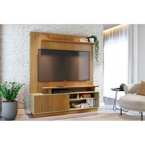 MDP e MDFO Home Theater Ares, da marca Madetec, é ideal para TVs de até 75 polegadas. Produzido em MDP e MDF com revestimento em pintura UV, conta com 1 porta deslizante em MDF frisado, 2 prateleiras e puxador dourado pontual.