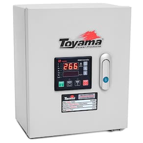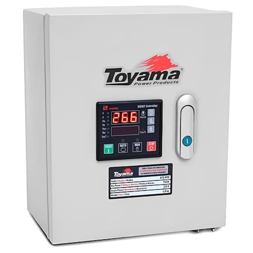 Painel ATS Trifásico ATS-T9 Toyama 380V, com cabo de conexão, detecta a interrupção ou a falta de energia elétrica e envia sinal de acionamento ou desligamento do grupo gerador TDG7500E3XP, TDG7500SE3XP, TDG8500E3XP ou TDG8500SLE3XP, que assume ou cessa, então a alimentação da carga requerida.