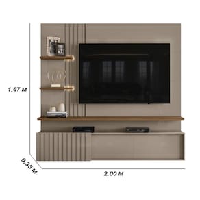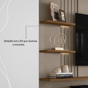 O Painel Bancada Suspensa Atena conta com 2 fitas de LED para iluminar e destacar seu ambiente, painéis e portas com detalhes ripados que trazem um charme único. Além disso, possui 3 portas de correr e painéis em MDP de 15 e 25mm, oferece praticidade, resistência e um design contemporâneo para transformar seu lar com elegância.