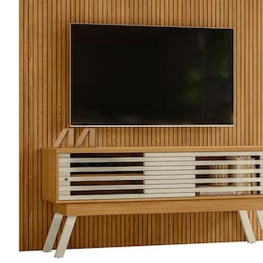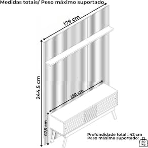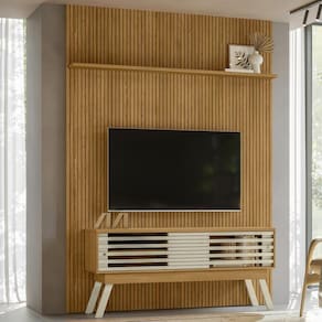 Painel e Bancada Panorama, conjunto atual que propõe um visual moderno e funcional para o seu lar. Estrutura em MDP/MDF com acabamento em pintura UV texturizada, suporta TVs de até 65 polegadas. Conta com portas de correr com sistema de abertura por trilho plástico, frisos do chão ao teto (MDF baixo relevo), prateleira superior e interna, além de 4 pés estilo retrô (em plástico). Fixação feita por parafusos. Este produto será entregue em 4 volumes.