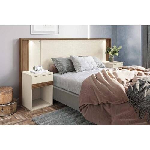 Painel Cama Box Madeirado Casal Bourbon c/ 2 Mesas 2 Gavetas e Leds Areia/Jatobá - Santos Andirá - Painel para Cama Box Casal com Mesa de Cabeceira e LED