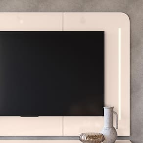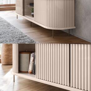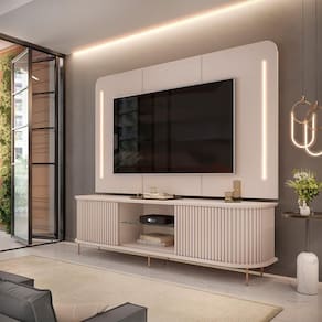 Saitama conta com 2 portas deslizantes ripadas, que combinam beleza e praticidade. Ele suporta TVs de até 75 polegadas (suporte para TV não incluído), ideal para uma experiência de entretenimento imersiva. Os pés metálicos cilíndricos na cor dourada adicionam um toque de luxo ao ambiente, enquanto a iluminação LED com lente difusora cria um efeito visual moderno e encantador.
