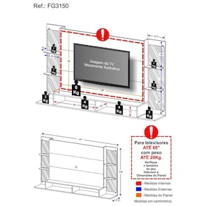 Dimensões do produto montado: Altura: 108 cm | Largura: 191 cm | Profundidade: 31,5 cm Tamanho Painel TV: 136 x 90cm *Devido as variações de tamanho dos televisores no mercado, sugerimos que verifique as medidas da sua TV e compare com o painel antes de efetuar a compra. *Não recomendamos utilizar suporte de TV articulado. *Você pode consultar as medidas internas na imagem técnica do produto.