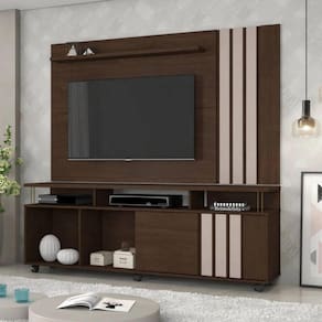 Características: Rodízios aparente Porta de correr com detalhe ripado Nichos para eletrônicos Tubo metálico Recomenda-se TV até 70 Acompanha suporte para TV Prateleira decorativa Espaço para TV: 1820mm x 930mm (LxA)