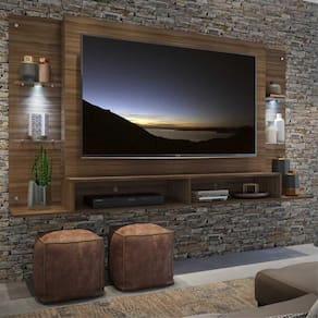 Conteúdo da Embalagem: 1 (um) Painel para TV 1 (um) Kit com 4 Prateleiras de Vidro 1 (um) Kit com 2 Luminárias LED 1 (um) kit com Suporte para TV