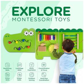 Educação Montessori O design desta placa ocupada está seguindo as regras educacionais Montessori. Com o objetivo de permitir que as crianças desenvolvam habilidades motoras, coordenação mão olho, habilidades de linguagem, habilidade de reconhecimento, compreensão do espaço, habilidades de contagem, iluminação musical e muito mais.