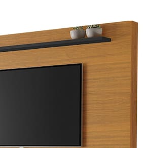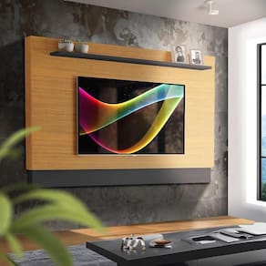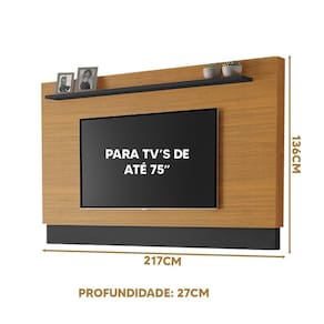 Este painel 100% MDF oferece espaço para uma TV de até 75 polegadas, uma prateleira superior e um design moderno e clean, adequado para vários ambientes, desde a sala de estar até o quarto.