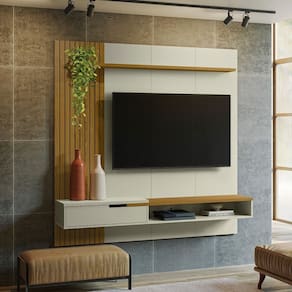 Painel Decor Ripado P/Tvs Até 65 Polegadas C/ Nicho Suspenso 180cm Off White/Cedro - Olivar Móveis