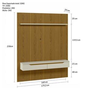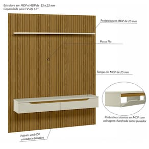 - Formato do móvel: Painel - Polegadas: Acima de 47" - Garantia: 3 Meses - Volumes: 3 - Tamanho Máximo da Tv: Até 65 Polegadas - Recomendações de manutenção: Recomendado uso de pano umedecido. Não aplicar lustra móveis. - Tipo de Porta: Basculante - Quantidade de Portas: 2 - Produto Necessita de Montagem?: Sim - Peso do Produto Montado: 685 - Material da Estrutura: Mdp e Mdf - Escala de Brilho: Acetinado - Acabamento: Pintura UV - Peso Máximo Suportado: 32 - Medida do Produto Montado (LXCXA): 33cmX179,2cmX218cm