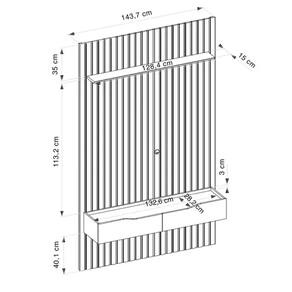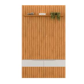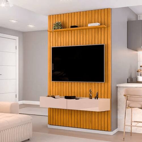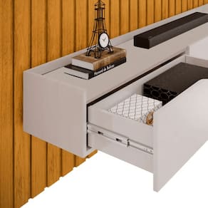 Painel ripado em MDF 15mm Prateleira 25mm com borda chanfrada Pode ser utilizado em vários ambientes Suporta TV até 60 Gavetas com frente usinada e corrediça telescópica