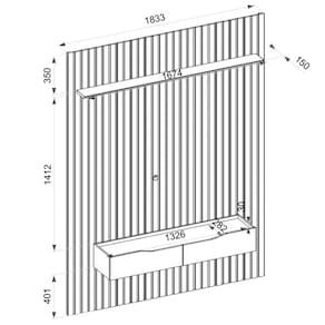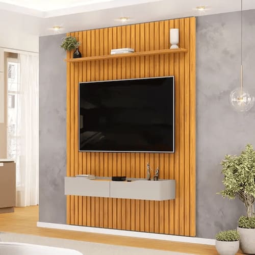 Painel ripado em MDF 15 mm Prateleira 25 mm com borda chanfrada Suporta televisores até 65 polegadas Acabamento das bordas: PVC e melamina